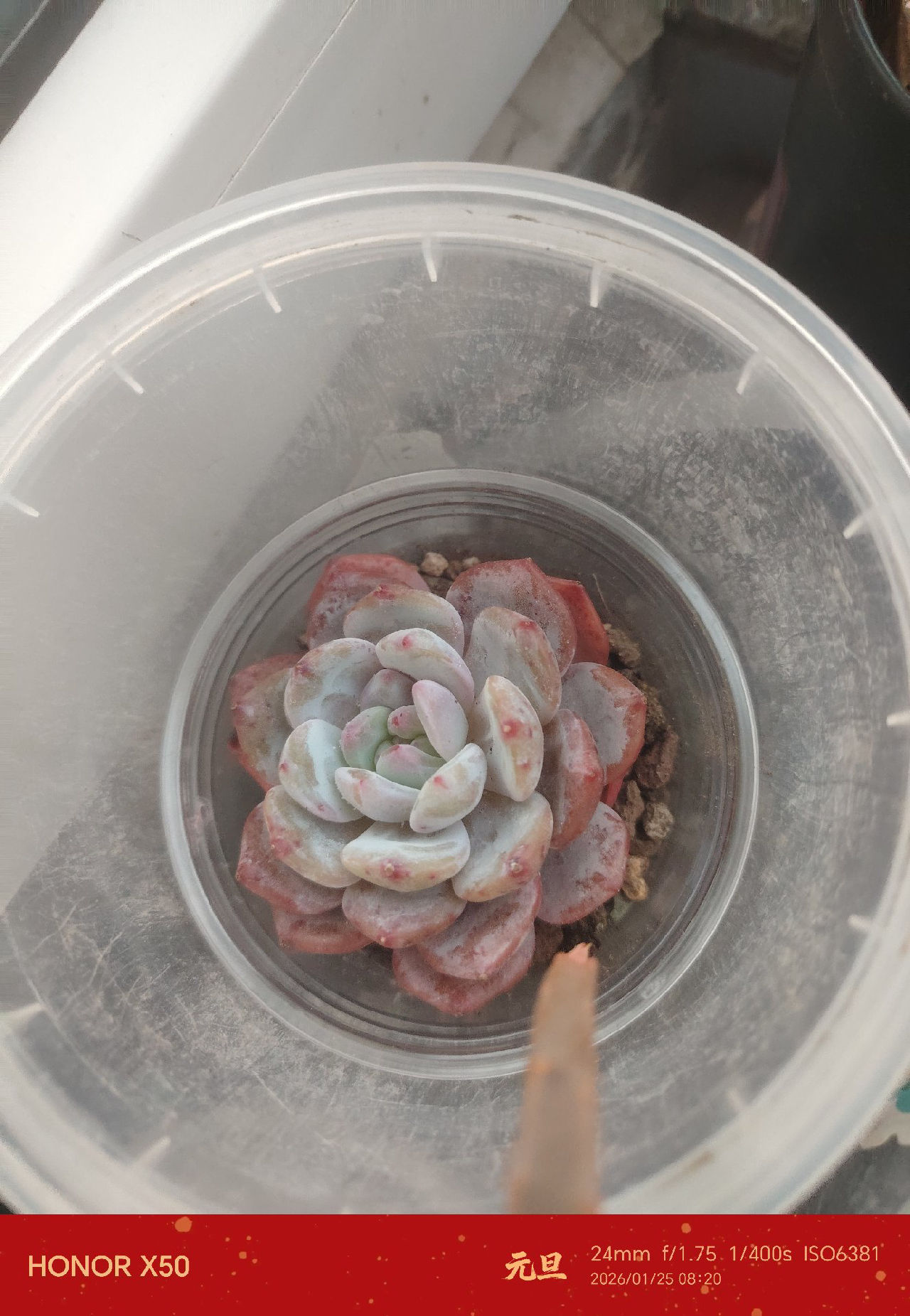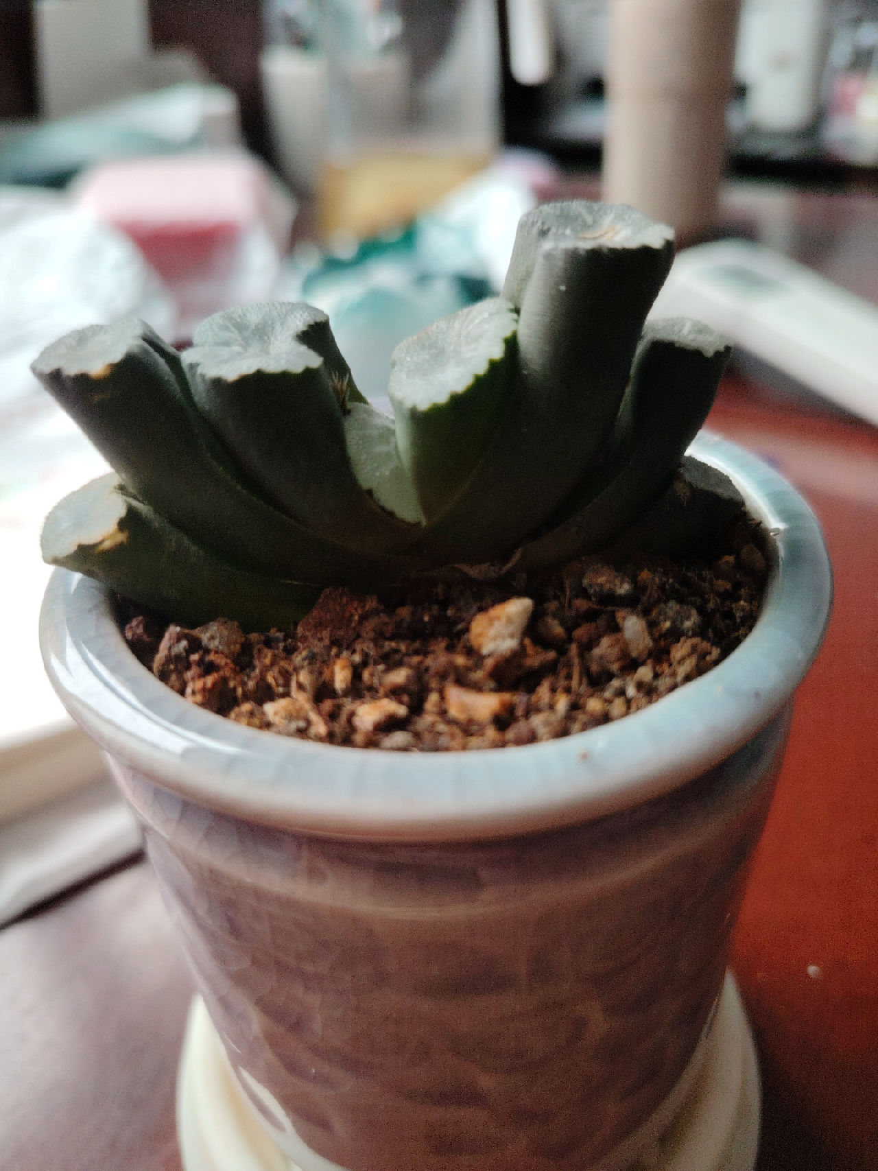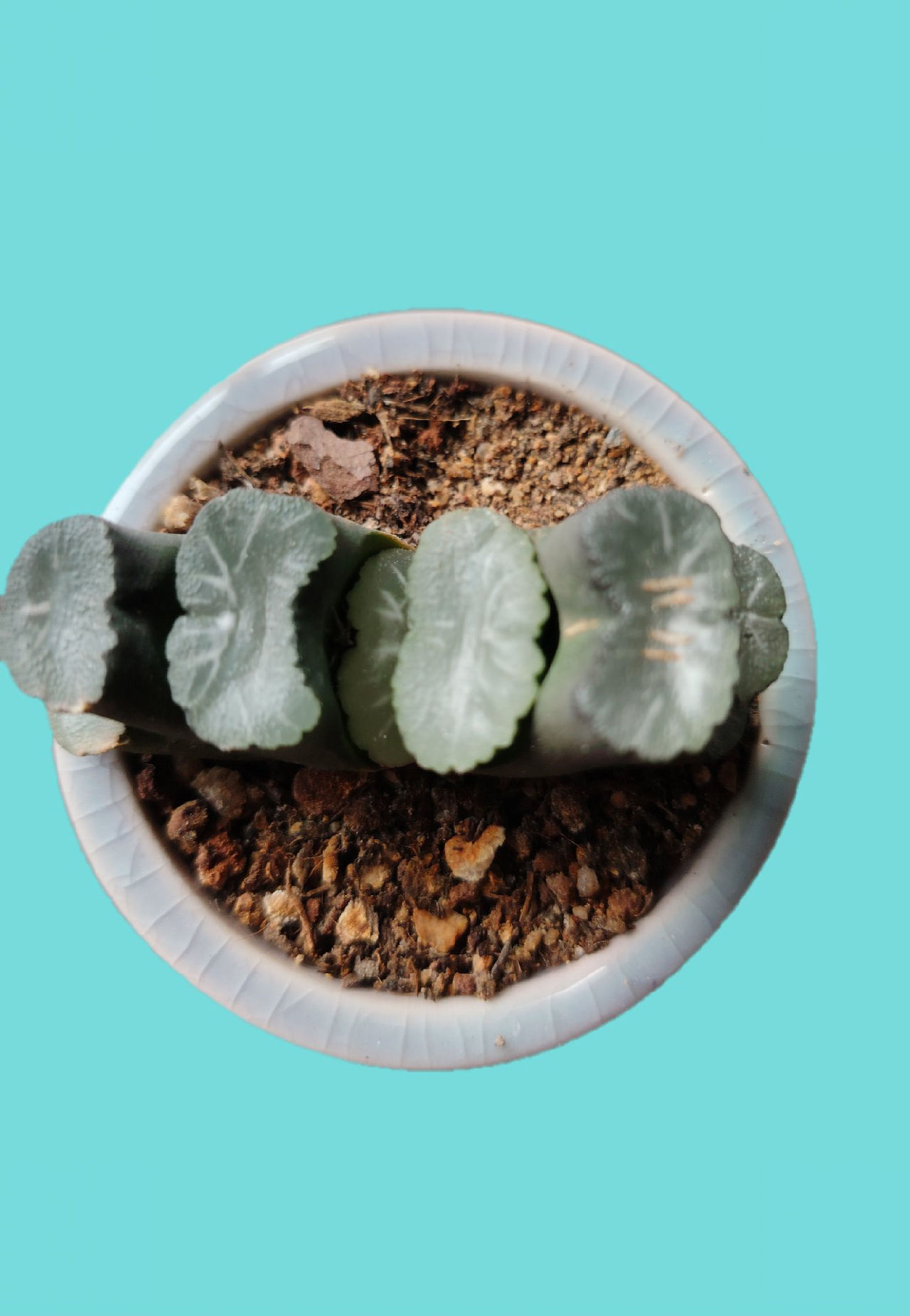 这株植物属于玉扇的一种,具体品种可能是草玉扇或荒肌玉扇。以下是分析依据: 1. 植物特征分析 叶片形态: 植株叶片呈扇形排列,两列对称,叶片顶部截面状,符合玉扇的基本特征。 截面略显粗糙,有轻微的疣状突起,但整体纹路不明显,未见复杂云纹或M型轮廓(如鬼岩城玉扇)。 叶片颜色: 叶片整体呈绿色,未见明显的白纹或特殊纹理,属于基础品种特征。 植株状态: 植株叶片较厚实